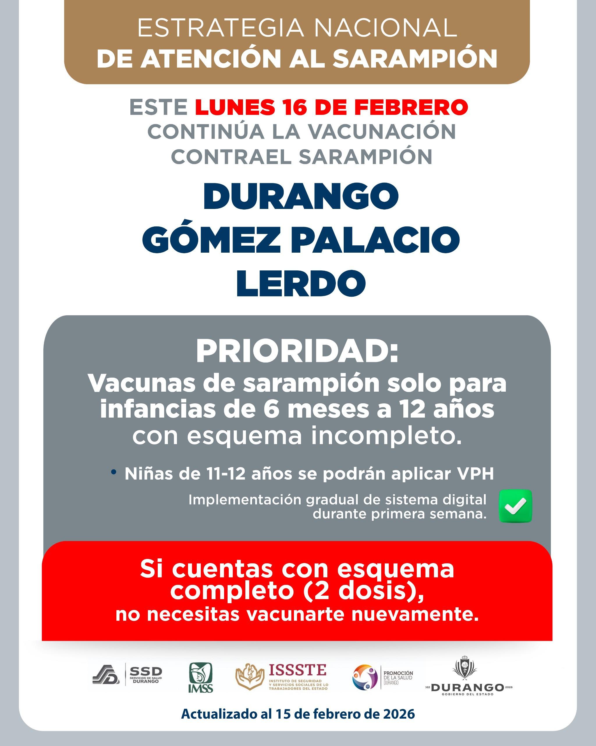 Por instrucción federal y como parte de la Estrategia Nacional de Atención al Sarampión, este lunes continúa en Durango la jornada de vacunación dirigida a población vulnerable, con prioridad para niñas y niños de 6 meses a 12 años que no cuenten con esquema completo. De manera complementaria, se informa que las niñas de 11 a 12 años podrán recibir la vacuna contra el Virus del Papiloma Humano (VPH), como parte de las acciones preventivas permanentes del sector salud.
