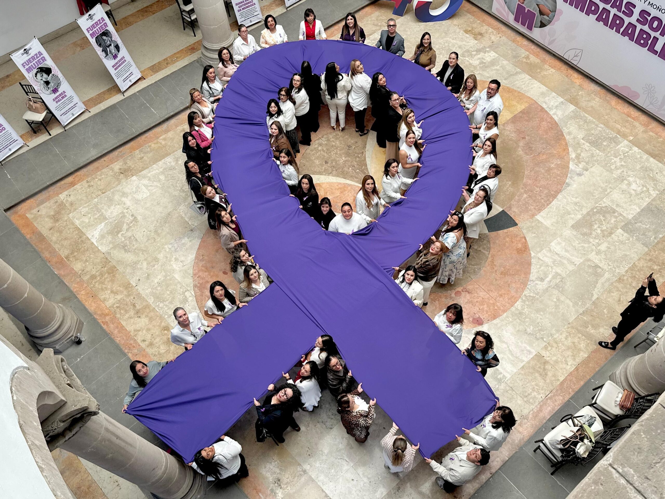En esta actividad también se realizó un moño humano gigante color morado con la participación de las asistentes, como símbolo del compromiso con los derechos de las mujeres.