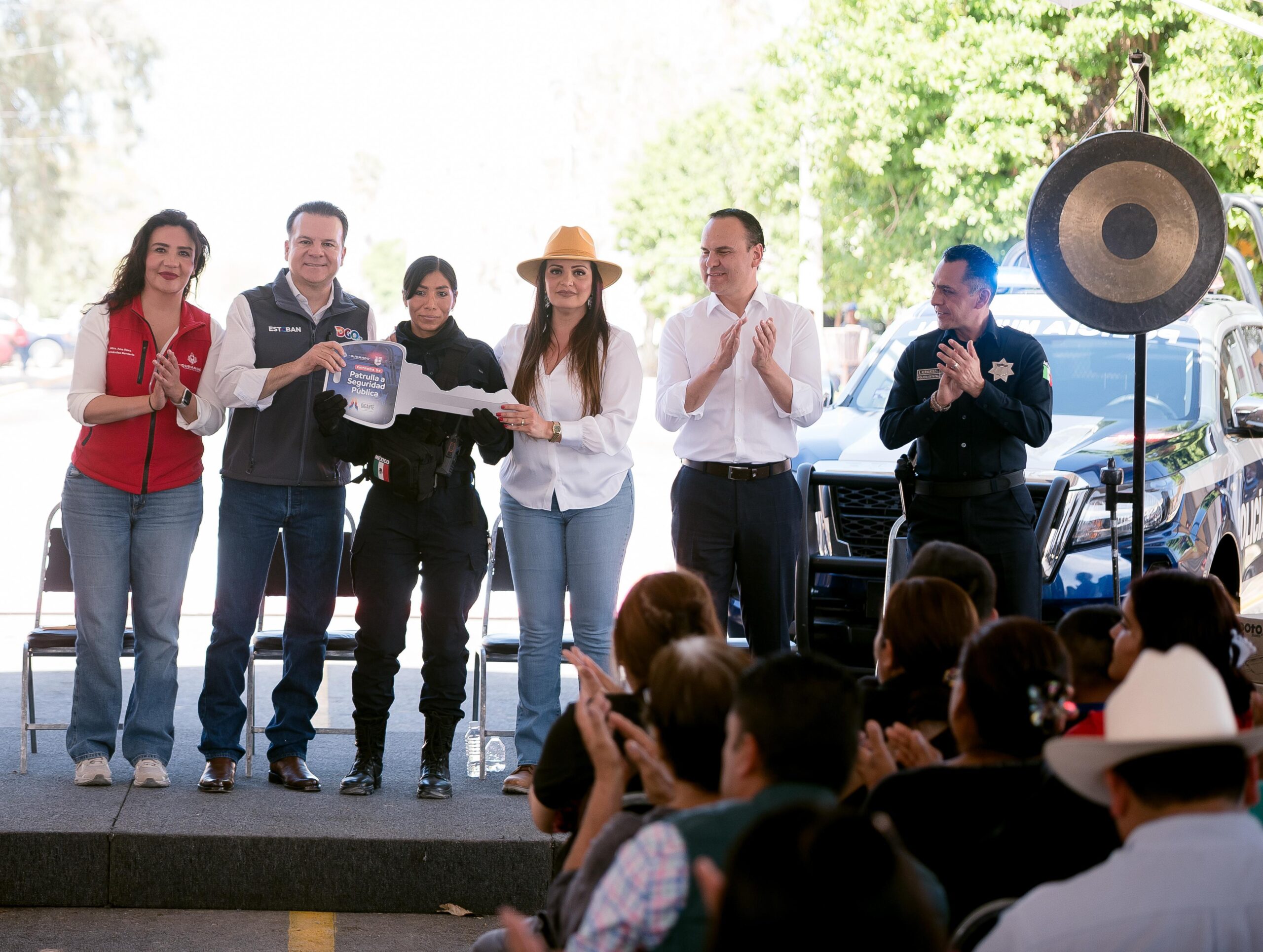 Villa León Guzmán, Lerdo, Dgo.– Con obras y apoyos que mejoran la imagen de la villa, fortalecen la seguridad y brindan mejores servicios a las familias, el gobernador Esteban Villegas Villarreal y la presidenta municipal Susy Torrecillas entregaron en Villa León Guzmán la pavimentación asfáltica de la calle Luciano López, una patrulla, equipamiento para Seguridad Pública y luminarias, como parte del trabajo conjunto que realizan el Gobierno del Estado y el municipio de Lerdo.